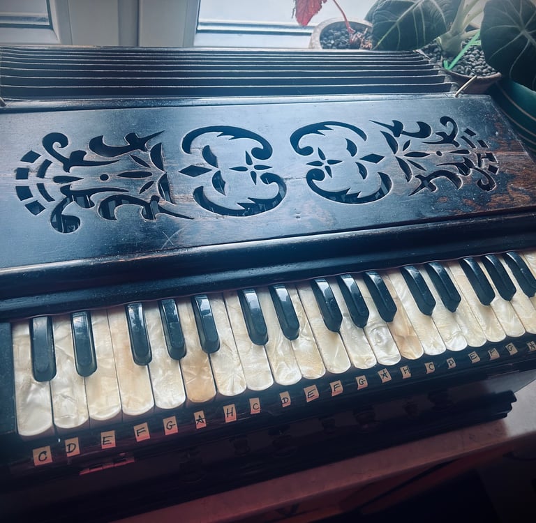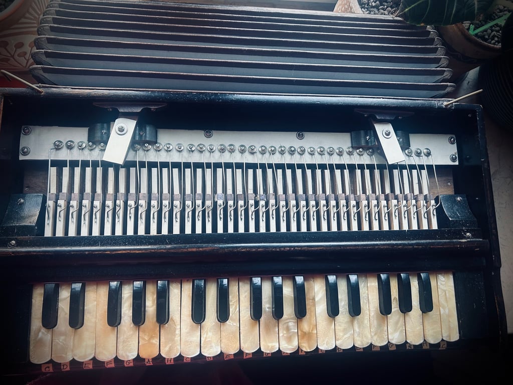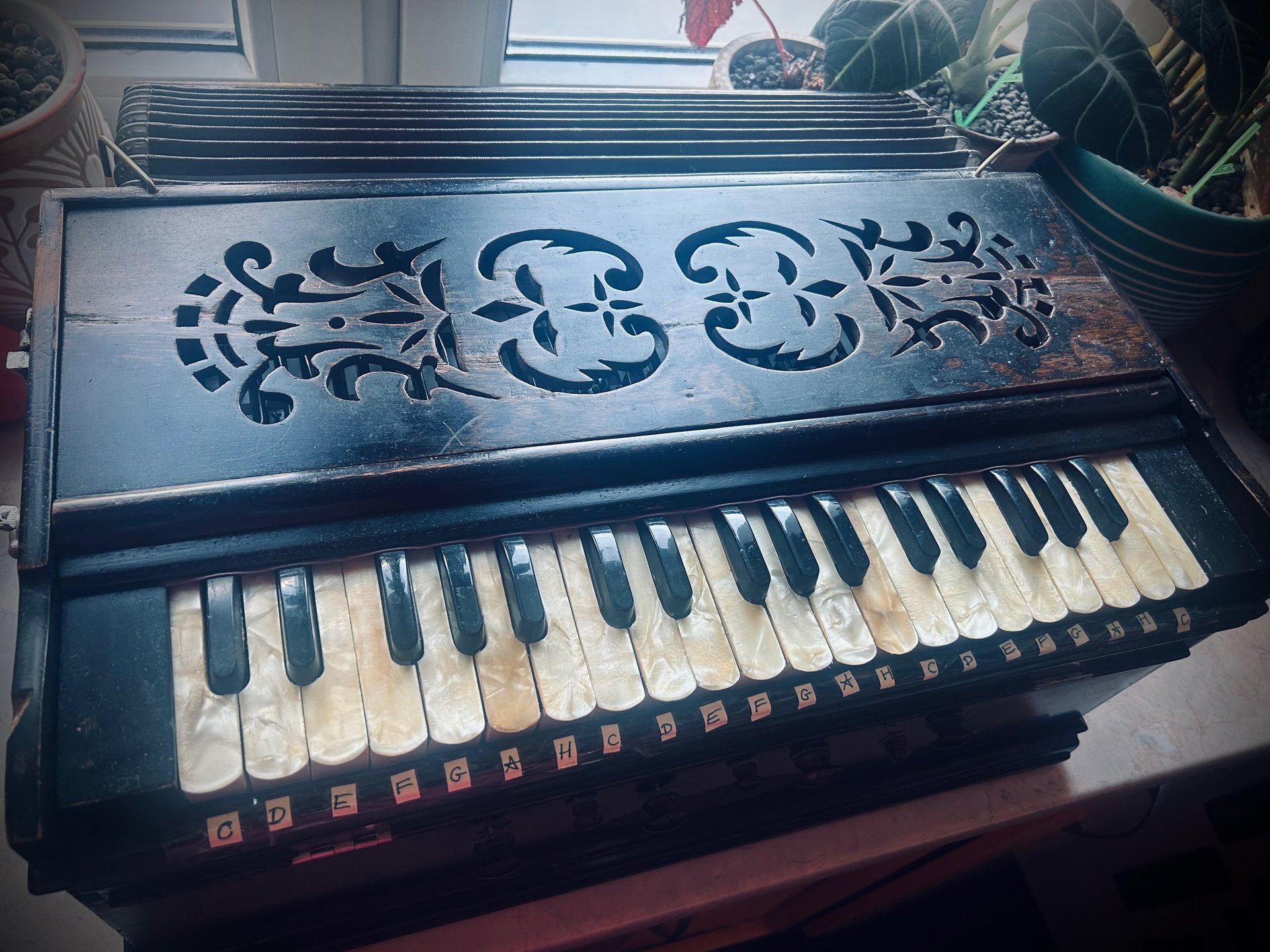 Jest taki ciekawy instrument, ja znam go pod nazwą harmonium. Starsi nazywają fisharmonią, w sumie słusznie bo budową są bardzo podobne - i wywodzą się historycznie z jednego źródła. Zawędrował do Indii z misjonarzami angielskimi w okolicach XIX wieku. Obecnie jest tam znane pod nazwą harmonium właśnie, samvadini , peti („pudełko”) lub vaja. W internetach ciekawych rzeczy można się dowiedzieć wpisując harmonium indyjskie. U nas to rzadki instrument, egzotyczny ciut i uważany za dziwadło przez specjalistów z profesjonalnych forów akordeonistycznych. Tak - są to ciekawe organy piszczałkowe, trzeba pompować żeby wydobyć dźwięk. Gra się siedząc na ziemi, lewej ręki używając do pompowania, a prawej do stukania w klawisze, które są jednakie z tymi w instrumentach klawiszowych. W gratisie są zamontowane trzy burdony oraz dwa głosy, którymi można trochę pobawić się samym brzmieniem (dodawać lub zdejmować góry czy dołu dźwięków).