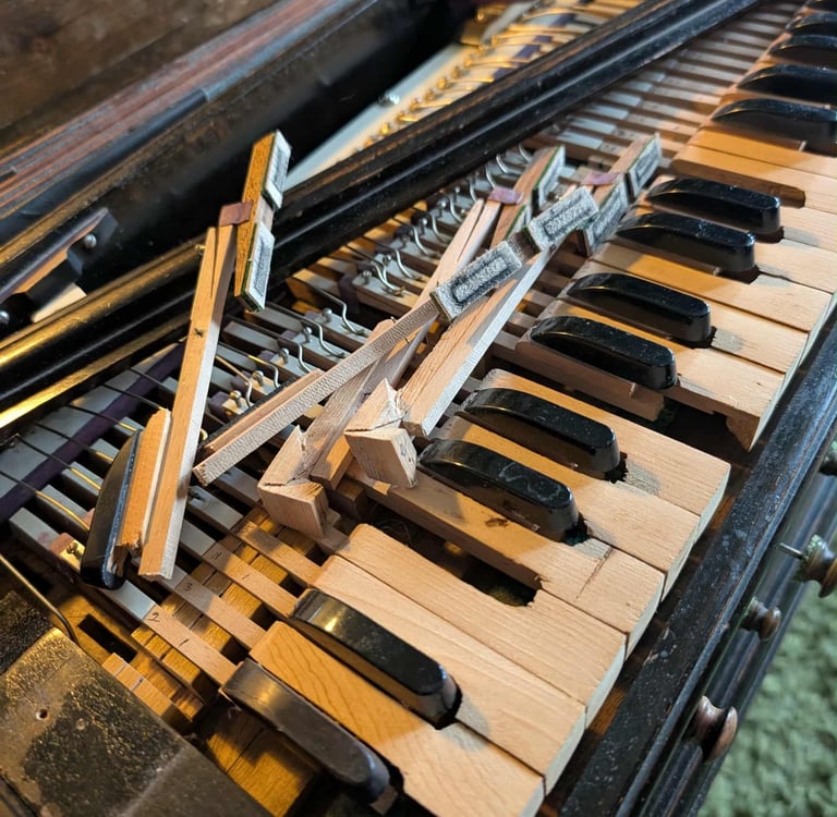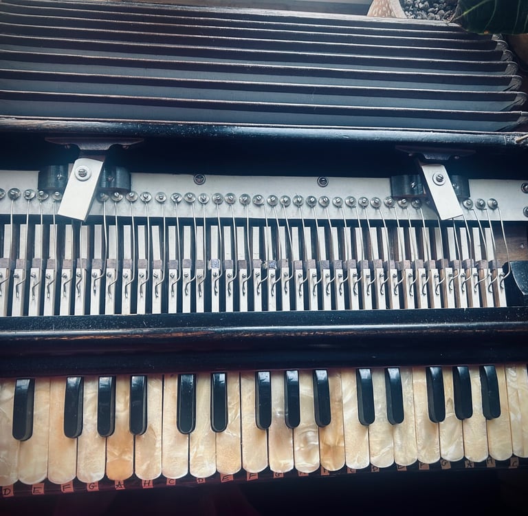 Lekcje gry, zakup oraz naprawę harmonium (w duchu zero warte - lepiej kupić używane i dać nowe życie) finansowałam w ramach Stypendium z Krajowego Planu Odbudowy pn. "Kompleksowy pakiet działań służących rozwijaniu umiejętności artystycznych i cyfrowych związanych z teatrem oraz jego plastyką sceniczną".