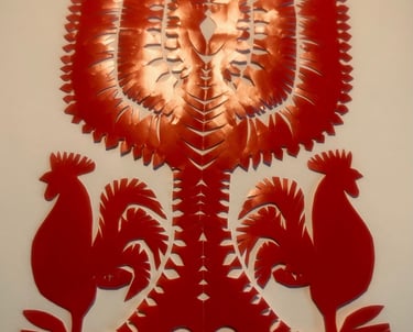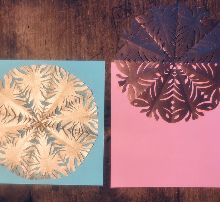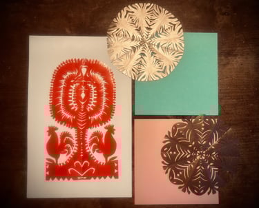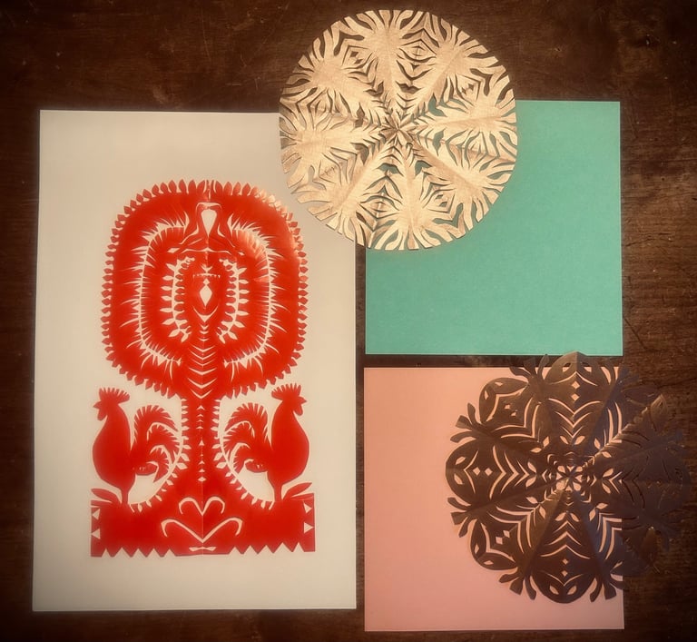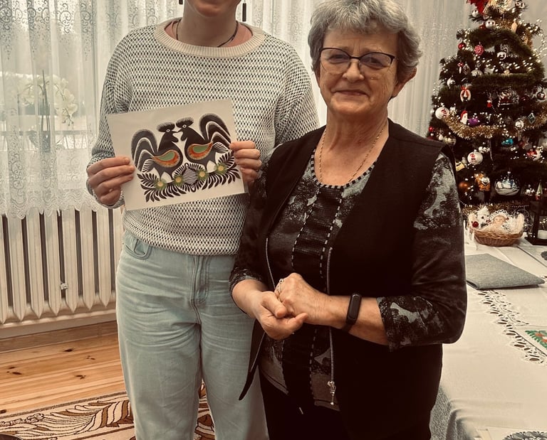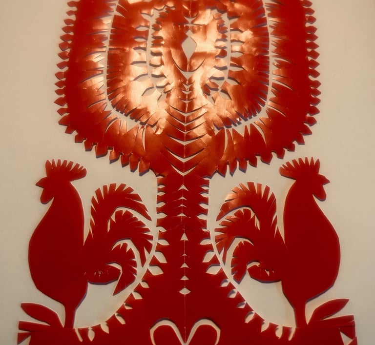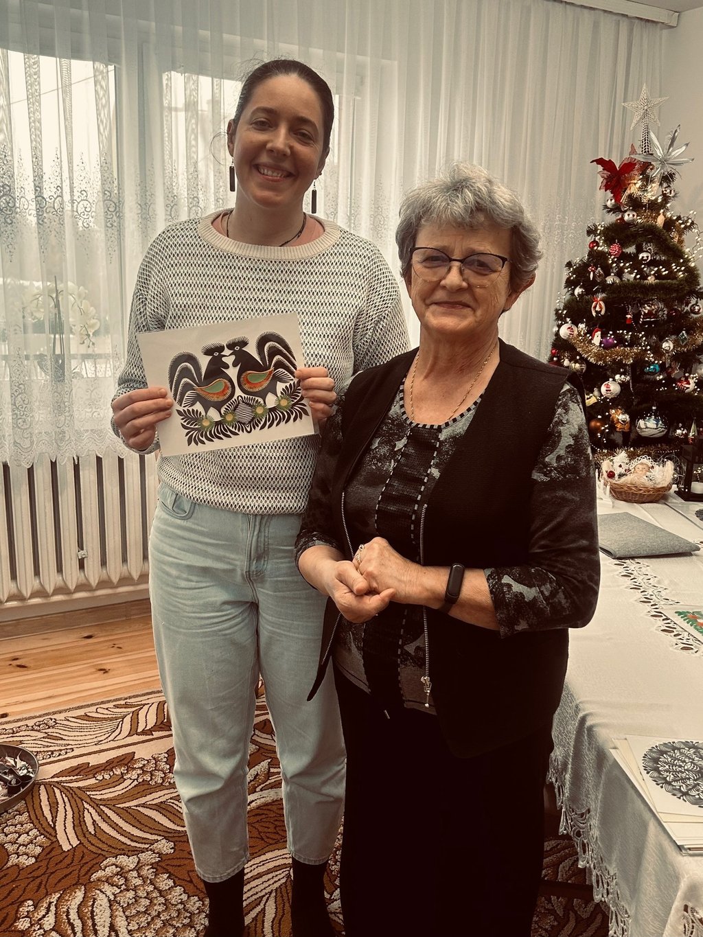 W ramach Stypendium z KPO dla Kultury wybrałam się do Kadzidła, gdzie mieszka i tworzy cudowna artystka ludowa Pani Wiesława Bogdańska, która między innymi jest mistrzynią w wycinance kurpiowskiej. W ramach warsztatów uczyłam się jak wykonać gwiazdę, w tym jak bez cyrkla wyciąć koło oraz jak składać papier w zależności od wielkości planowanej ozdoby. Zrobiłyśmy również leluję (to rodzaj drzewka) z kogucikami.