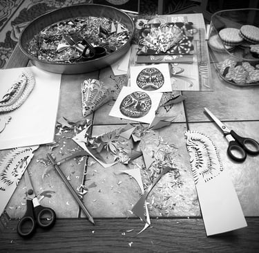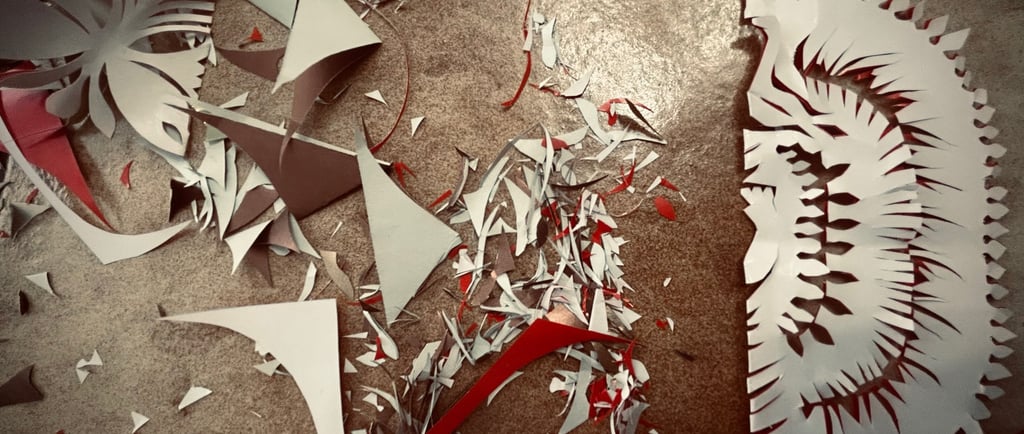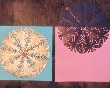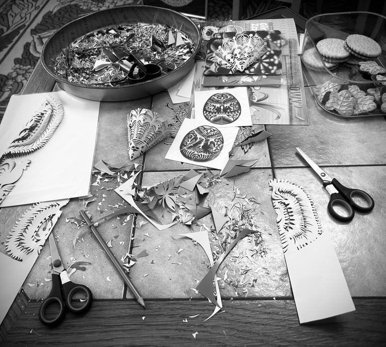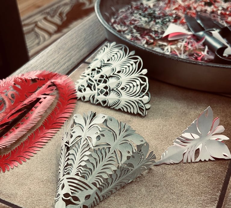 Podczas wycinania mogłam posłuchać opowieści Pani Wiesławy o nieistniejącej Spółdzielni „Kurpianka” z Kadzidła oraz wielu międzynarodowych wyjazdach, na które artystka wyruszyła dzięki (jak to mówiła jej mama) tym papsierkom.